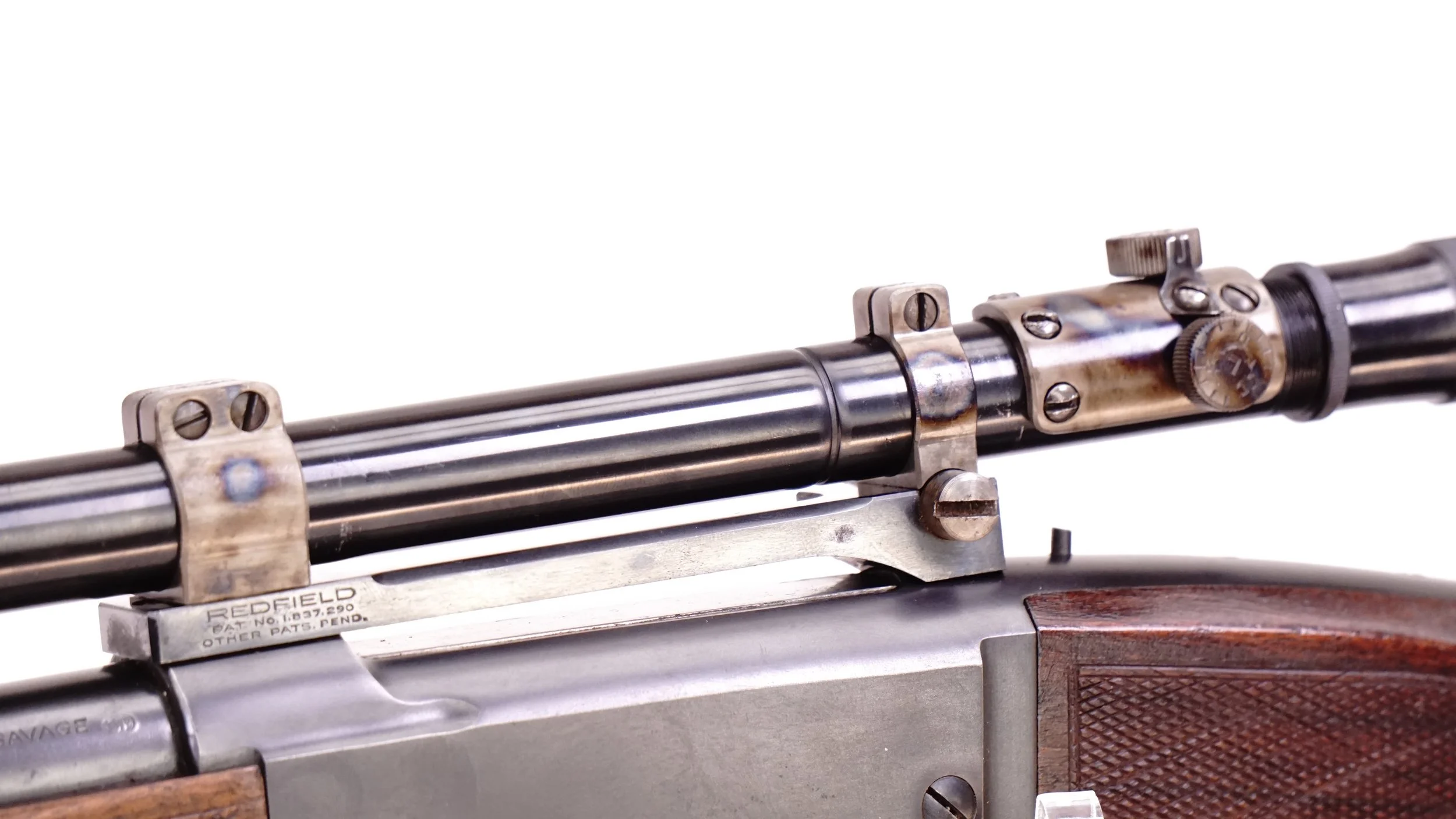 Later versions of the Savage 99 commonly carried variable scopes. Here a Vintage Gun Scopes refurbished Weaver V7W (widescreen) and Vintage Gun Scopes restored color case hardened Weaver detachable top mount rings sit atop a beautiful Savage 99 C model. This scope allowed for 2.5 to 7x variable power.